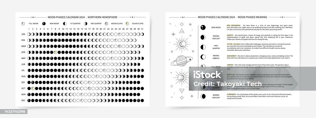 One Page 2024 Year Moon Calendar And Moon Phases Meaning Modern